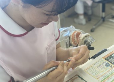 本校では歯科衛生士として活躍するために、より多くの実習を専門の設備を使って、少人数制できめ細やかな指導を行っています。
